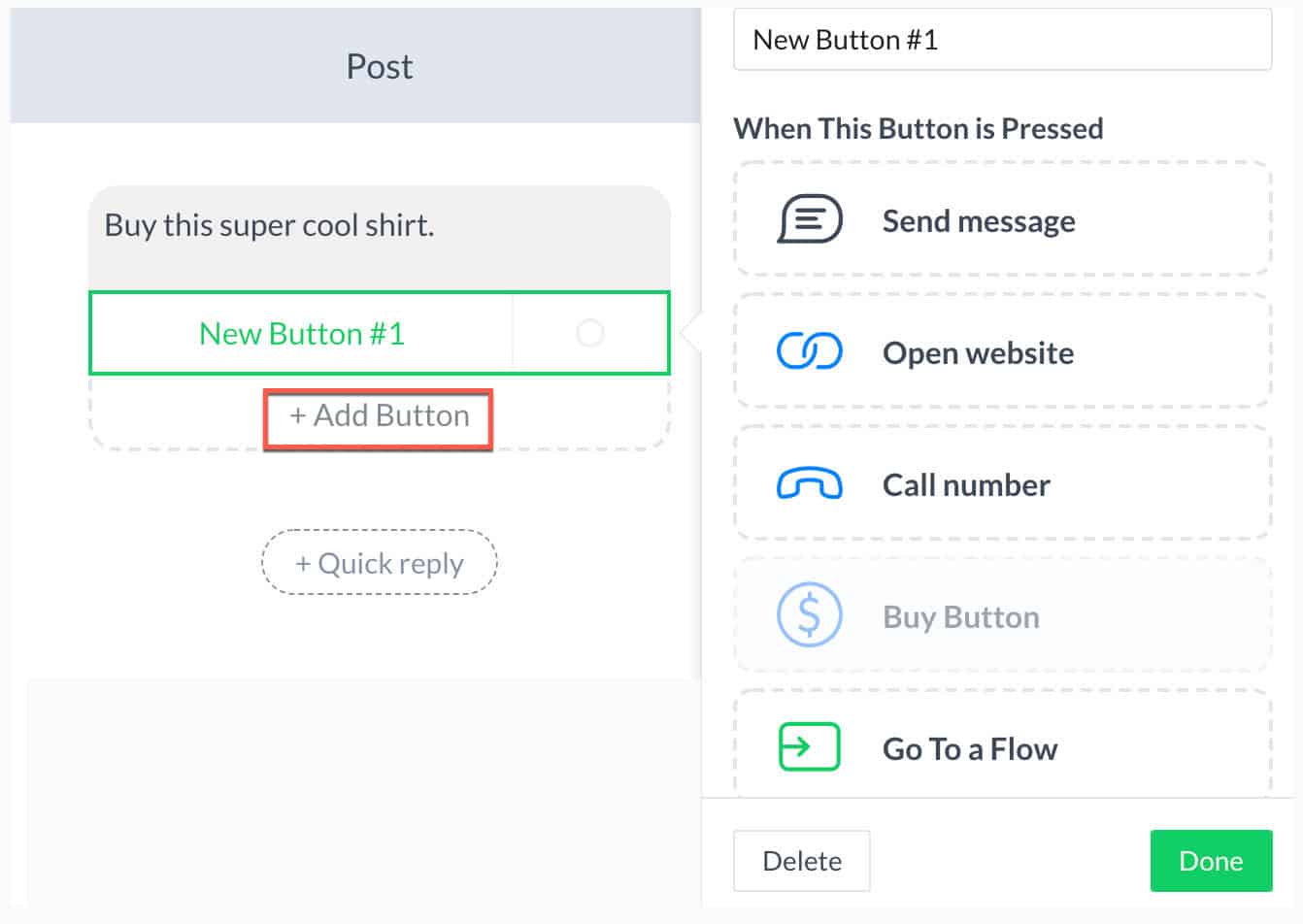 Now all you need to do is create a message and flow that leads users to that buy button. Of course, you’ll also need to link this to your Facebook page in the form of a post so when someone clicks on the post, the flow you’ve set up will trigger.